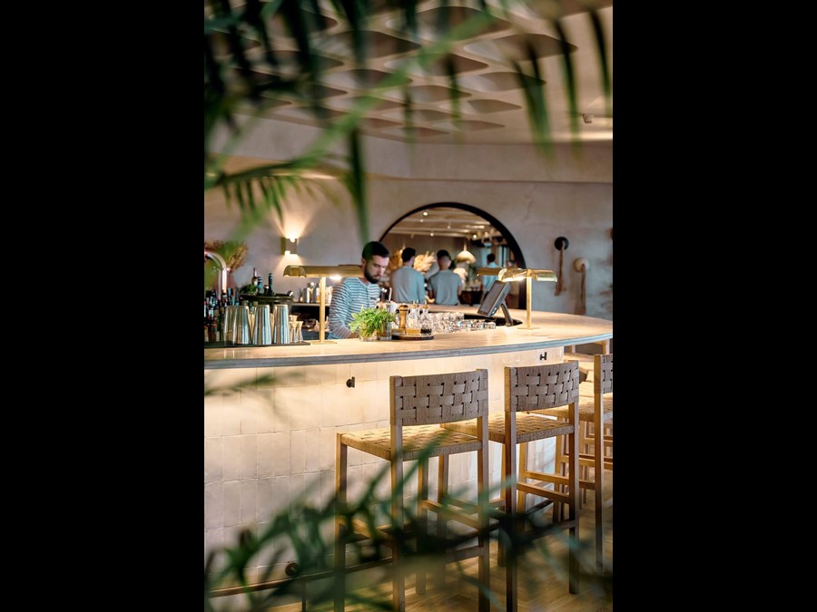 A zona de bar, bastante ampla, é marcada por um imponente balcão que convida a cocktails e petiscos ao final da tarde.