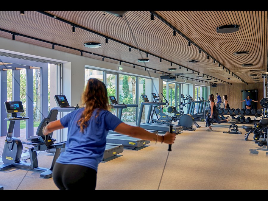 The gym features a machine room, a fitness room, and an outdoor area ideal for open-air workouts.