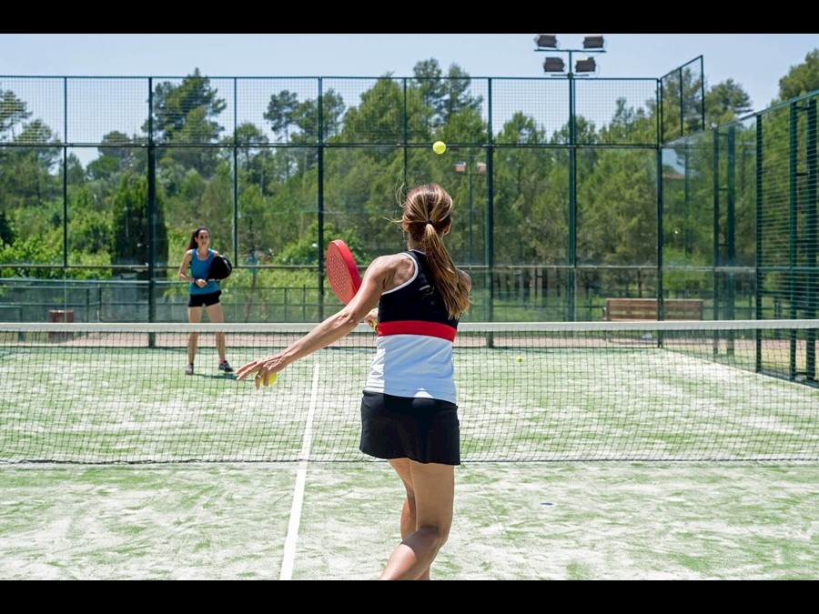 The hotel features two tennis courts, one padel court, a volleyball net, and an area dedicated to various sports activities.