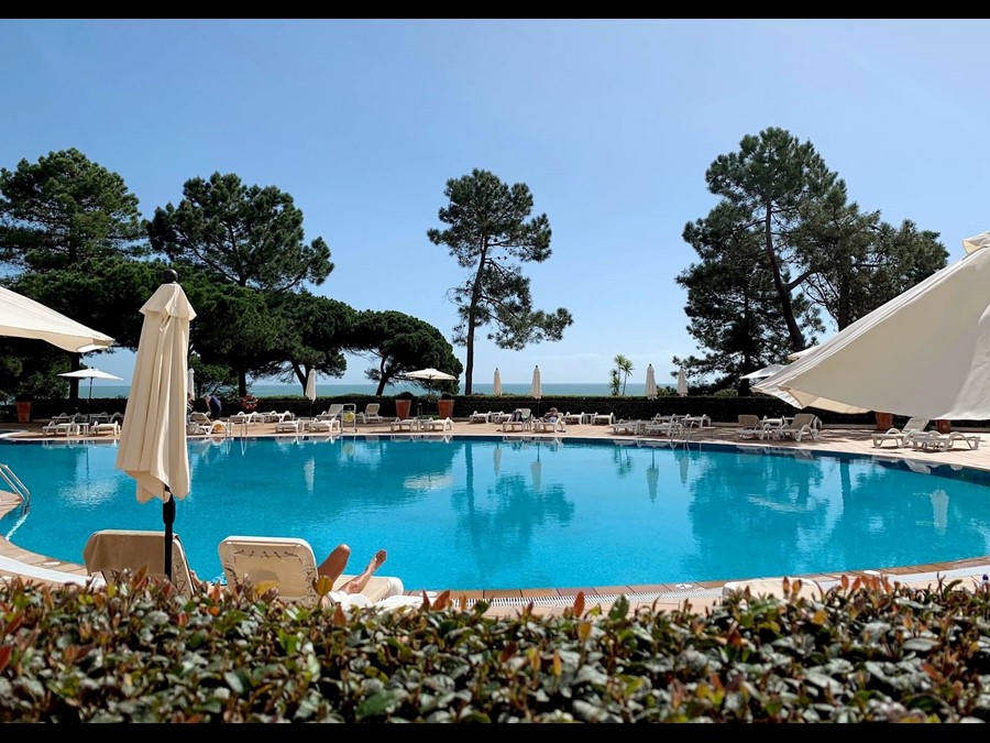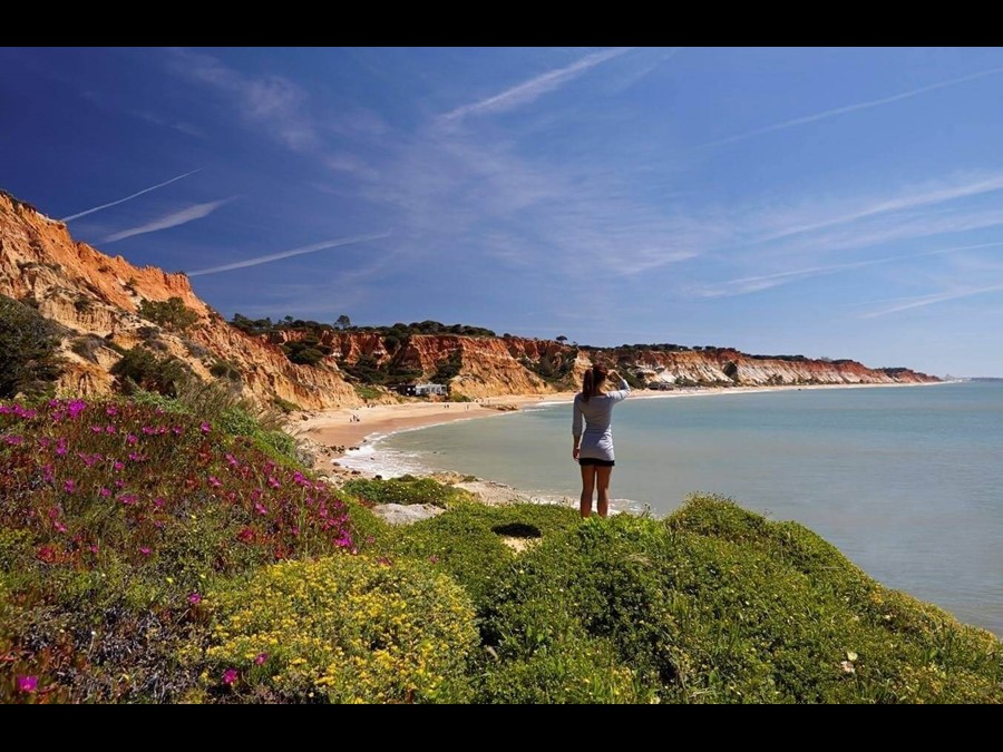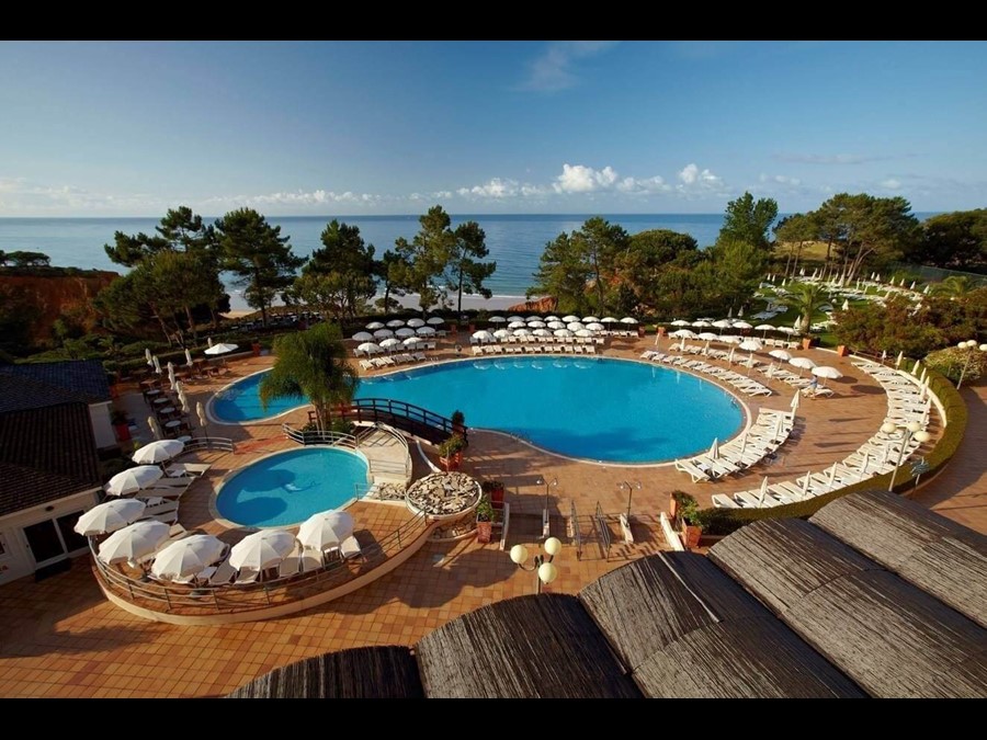 Een breed zandstrand ligt aan de voet van het hotel. Het witte zand versmelt met de typische rode rotsen van de Algarve.